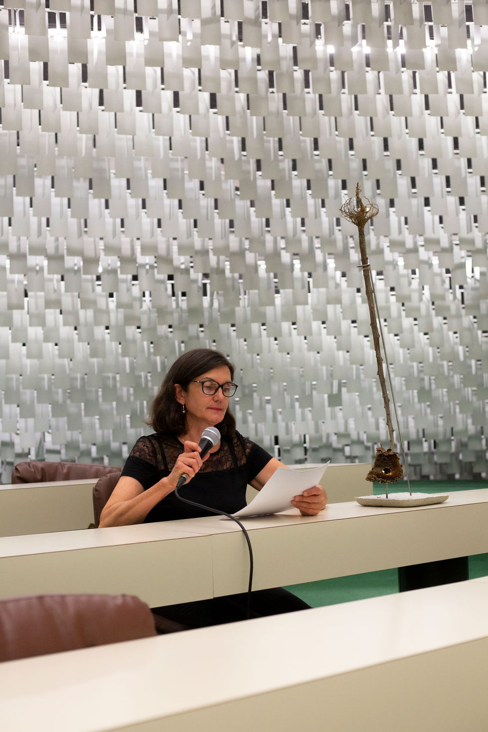 These sculptures are an ode to the mortality of life. After conducting cosmological research on dead stars, Carla Adra uproots sunflowers at the end of their lives and presents them, roots towards the sky, hollowed out and lit from the inside, as a tribute to the recent discoveries on black holes, the fusion of two of which could be the origin of the gold molecule.