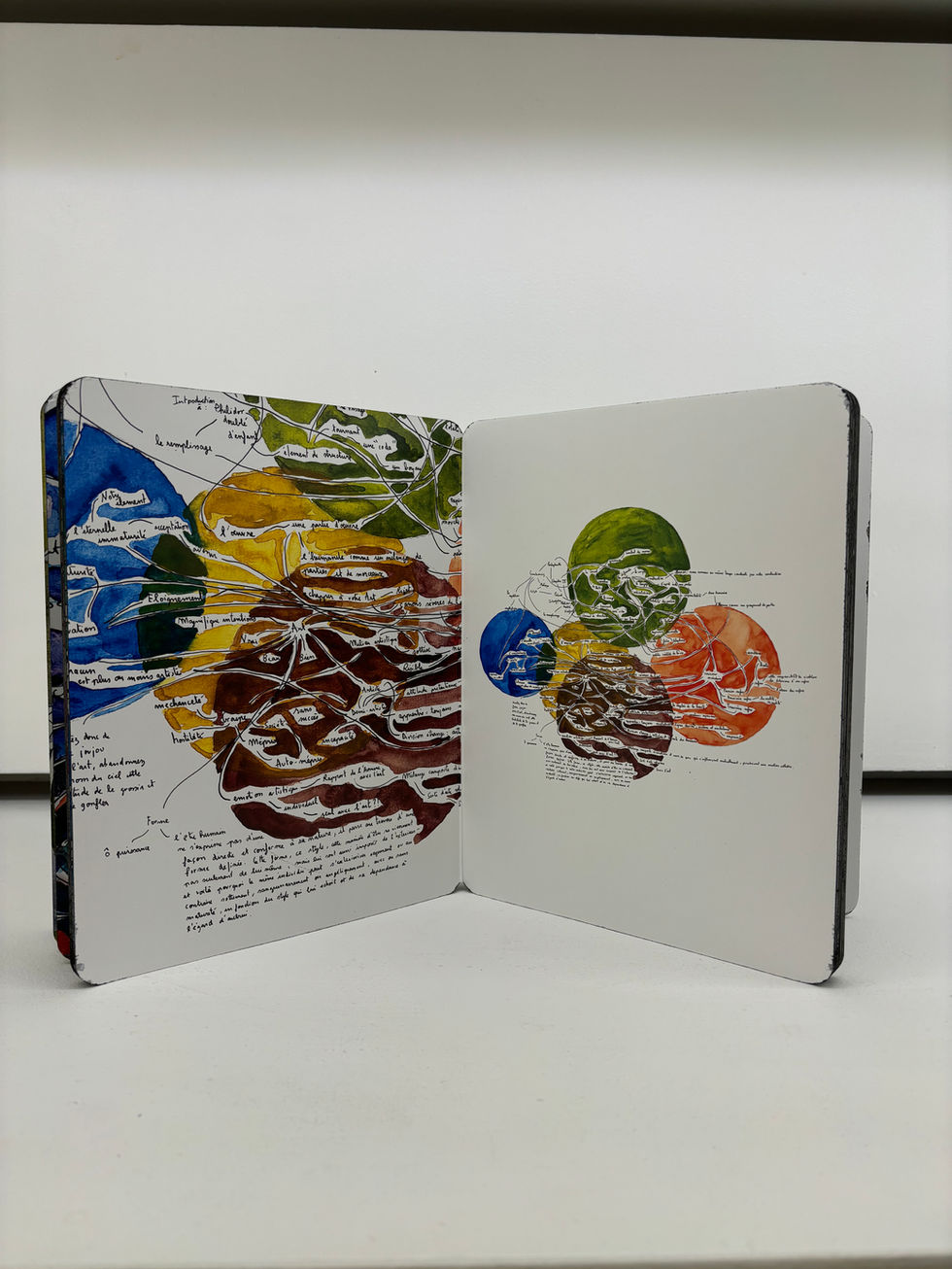 Artist Carla Adra's “Se perdre sans peur” borrows its form from children's books: rounded corners to avoid hurting, cardboard pages offering greater resistance and sturdiness to shocks, glossy appearance and tinted edges to protect against stains and dirt. It brings together all the mind maps created by the artist during her residency at RIGA, in July and December 2023, based on works related, for the most part, to the worlds of play and communication. Themes covered include children's mime and theatrical play, the animal form and self-design, radio waves and light radiation.